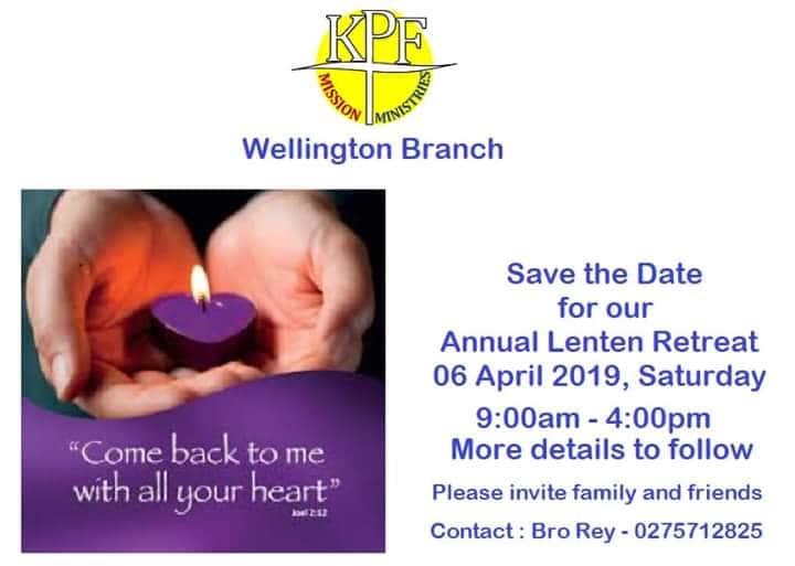 The Annual Lenten Retreat of Wellington Branch will be held on the 6th of April, Saturday. To all Wellington brothers/sisters, please note this date on your calendar and wait for the details of the venue. Let’s keep our KPF way of life burning!