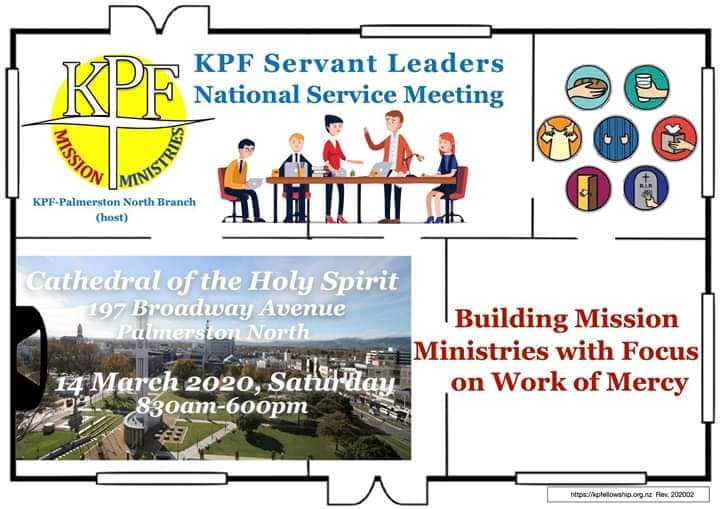 SC members, Branch/Mission Unit Heads, Intercessory Ministry Heads and Outreach Ministry Heads are all enjoined to be present on 14 March 2020, Saturday, from 830am to 6pm, for a servants meeting at the Parish Hall, Cathedral of the Holy Spirit, in Palmerston North.