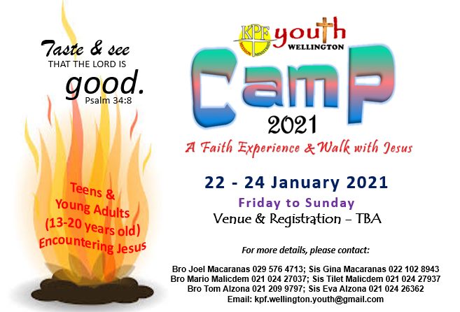 Youth Camp in Wellington on 22-24January joeyibarra07/01/2021Uncategorized Post navigation PreviousNext Share this: stories to others and be a witnessTweetLike Loading...