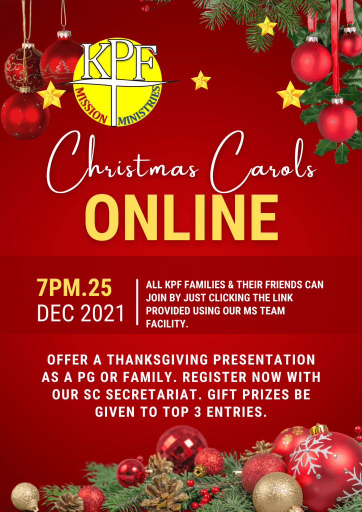 All families and prayer groups are called to join this fun Christmas Carols Presentation. Link is provided on our KPF MS Team calendar.